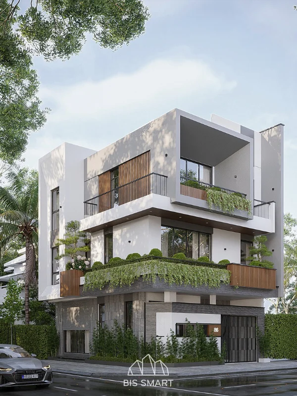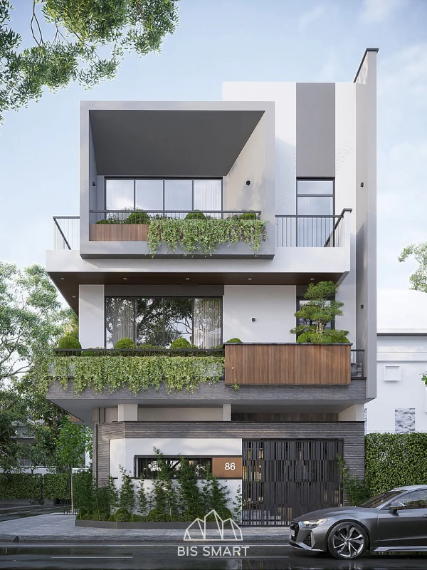 Vật liệu sử dụng cho mặt tiền có sự đồng điệu với không gian nội thất bên trong, tạo nên một chỉnh thể thống nhất từ ngoài vào trong. Đây là cách Bis Smart thường áp dụng để đảm bảo công trình không bị rời rạc giữa kiến trúc và nội thất – một yếu tố quan trọng trong các dự án thiết kế kiến trúc và nội thất.